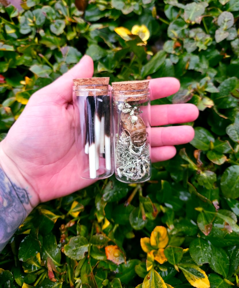 Handcrafted curiosity vials filled with ethically sourced porcupine quills and a cicada shed.