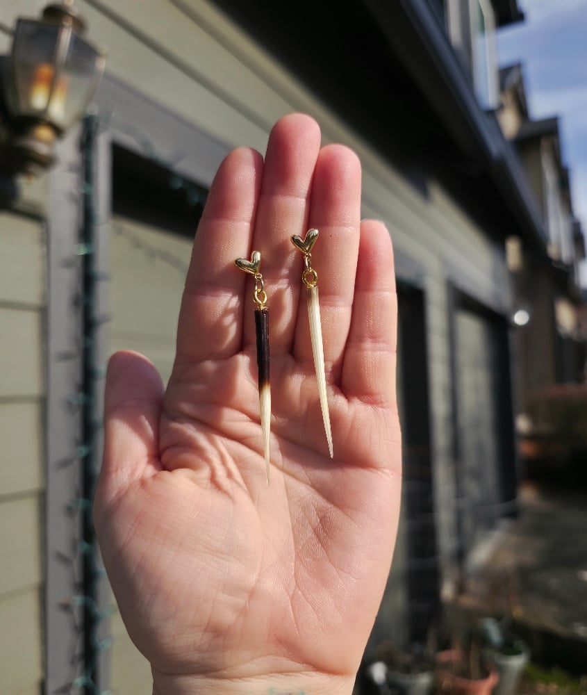 Handcrafted earrings made with ethically sourced african porcupine quills and 18k gold plated heart shaped hooks.
