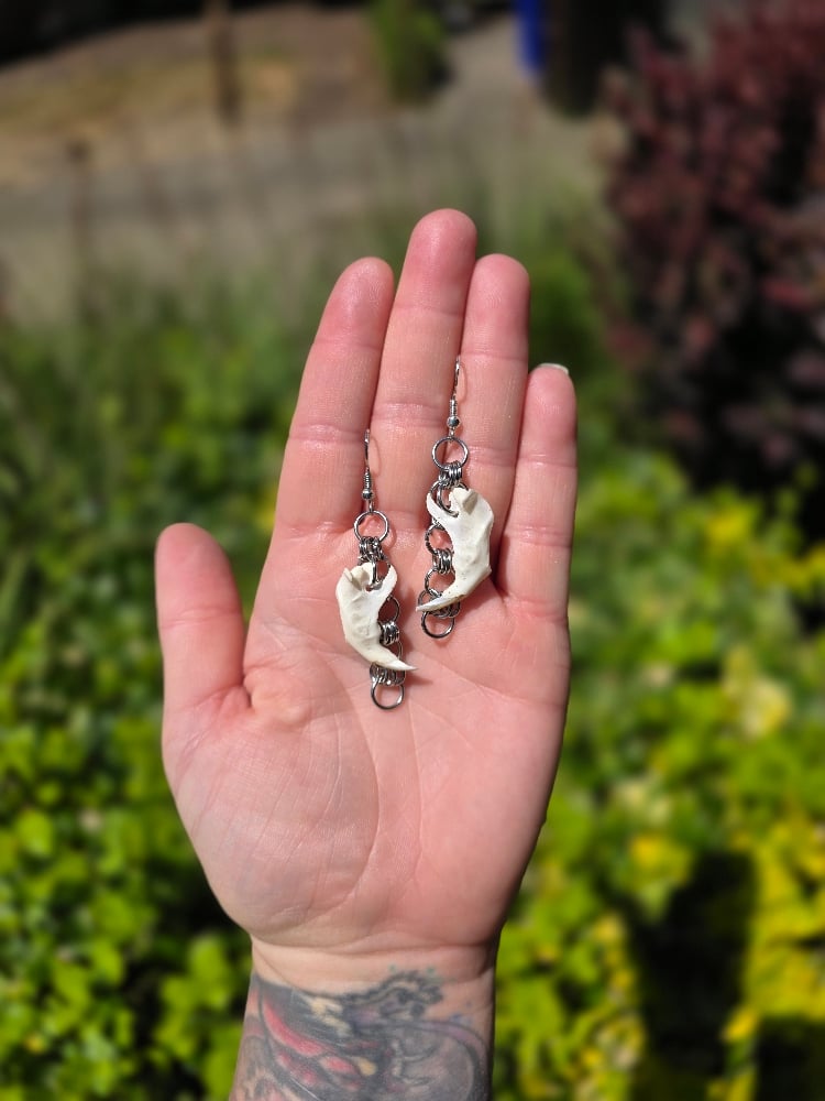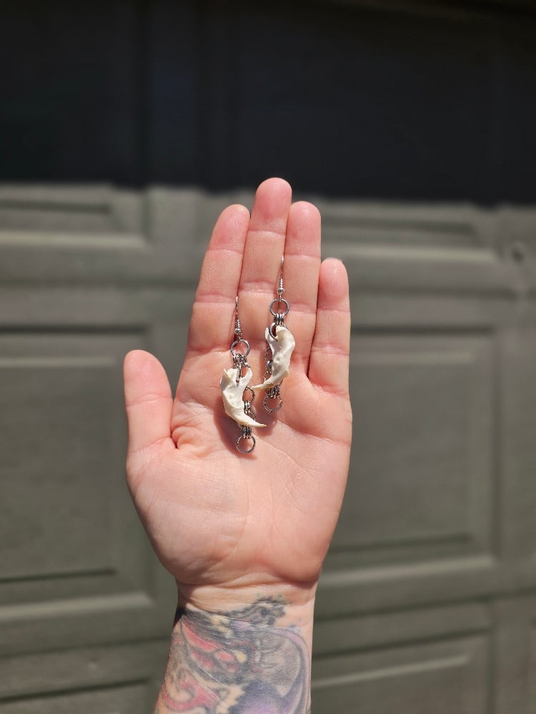 Handcrafted earrings made with ethically sourced gopher jawbones, stainless steel jump rings and sterling silver plated hooks.